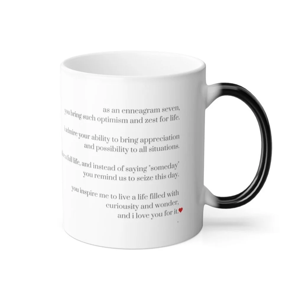 These Enneagram themed mugs change color and will be the gift that keeps on giving. The heat-reactive surface reveals the gifts of the unique Enneagram personality type. The mug is black when cool, but when filled with hot liquid turns white to reveal the message. The ceramic cup will go back to its original black outside and white inside when it cools down.